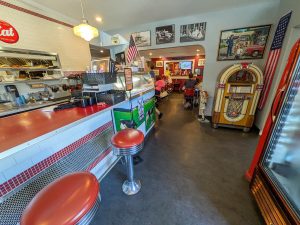 Upon entering the cozy red structure, you’ll be greeted by kind staff members. While the overall aesthetic isn’t retro, you still get a classic American diner vibe from the seats, tables, and the old school jukebox.