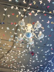 Taking a seat, you’ll start to see even more of Sally’s colorful affair. The walls might be grey, but the ceiling is awash in color. Butterflies, colored and patterned in every imaginable way, hang from the ceiling, broken up only by delicate looking glass chandeliers.