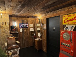 Once inside, you’re met with what seems to be a small barber shop, complete with an antique-looking mirror, barber’s chair, and cigarette machine. We won’t spoil all the fun in this review, but if you find the clues, you can trigger a false wall to swing open, finally revealing the true Speakeasy Saloon. (Our hint: follow the Camels!)