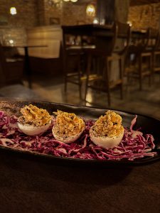 We ordered the Salmon Devilled Eggs and French Onion Soup to start, both of which came quickly. The eggs, four beautifully-plated halves, were perfect mouthfuls, and the soup was made with silky bone broth, caramelized onions, and plentiful gruyere, just as it ought to be.