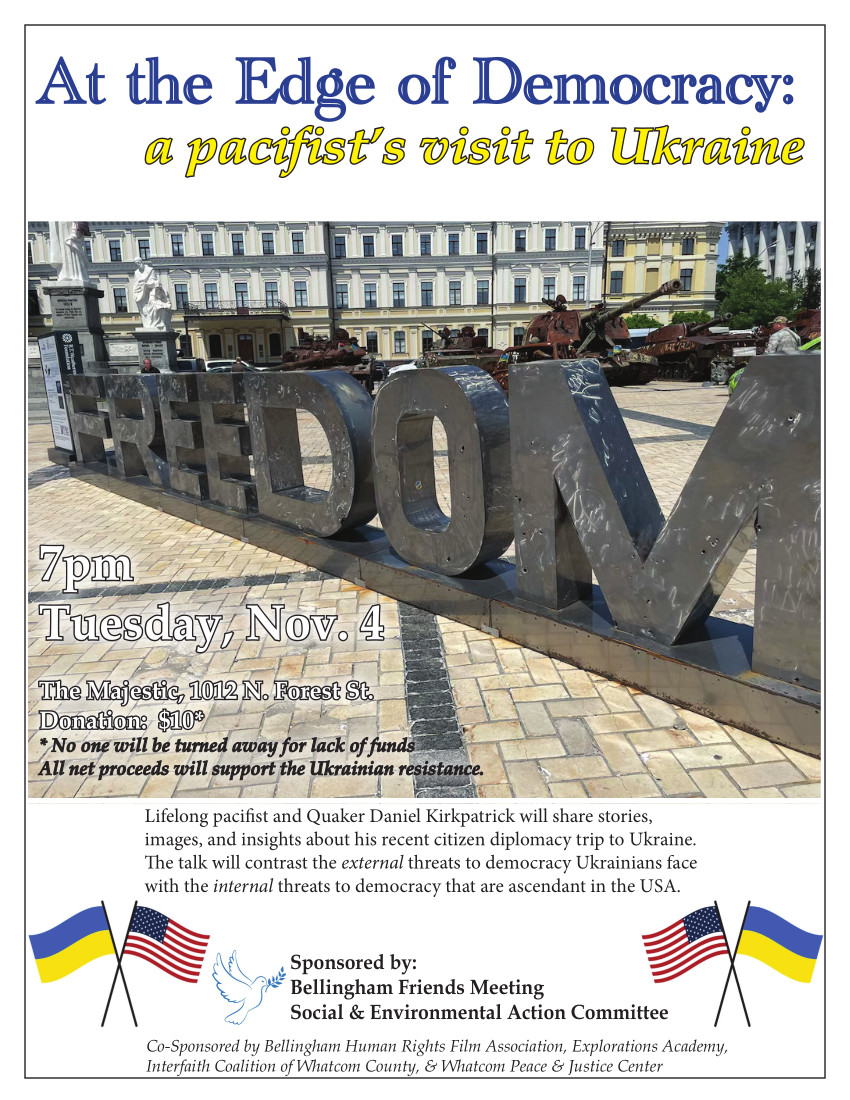 Lifelong pacifist and Quaker Daniel Kirkpatrick will share stories, images, and insights about his recent diplomacy trip to Ukraine. The talk will contrast the external threats to democracy Ukrainians face with the internal threats to democracy that are ascendant in the USA.