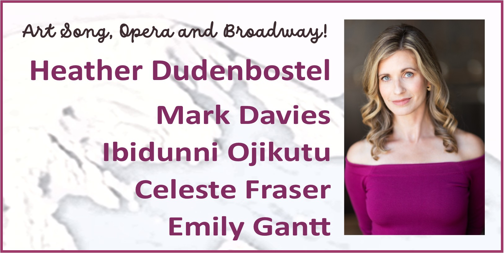 Bellingham Music Club brings together artists of incomparable talent: soprano Heather Dudenbostel will be joined by baritone/pianist Mark Davies, sopranos Ibidunni Ojikutu and Celeste Fraser, as well as pianist Emily Gantt in a vocal extravaganza!