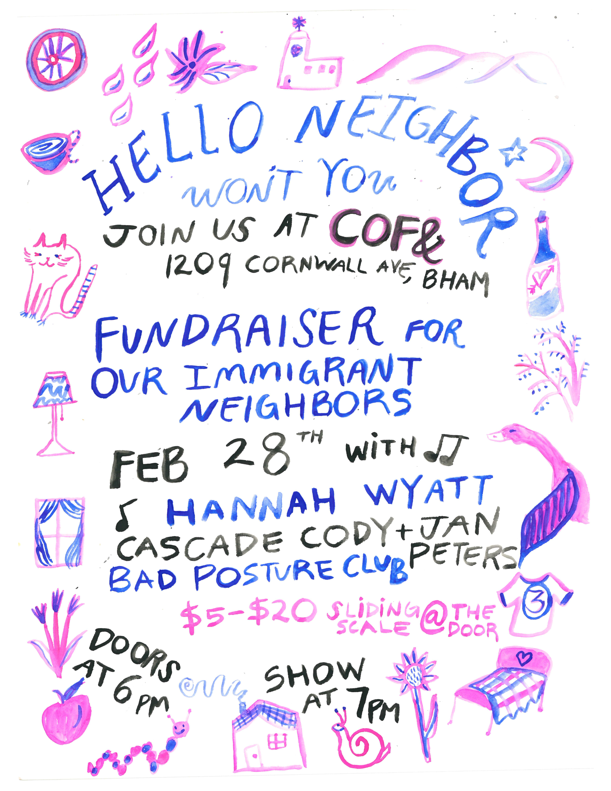 Enjoy music by Hannah Wyatt, Bad Posture Club, and Cascade Cody with Jan Peters. All funds raised will be redistributed directly to local immigrant families in need of funds to cover rent, food, immigration lawyers, and supplies for infants and children.