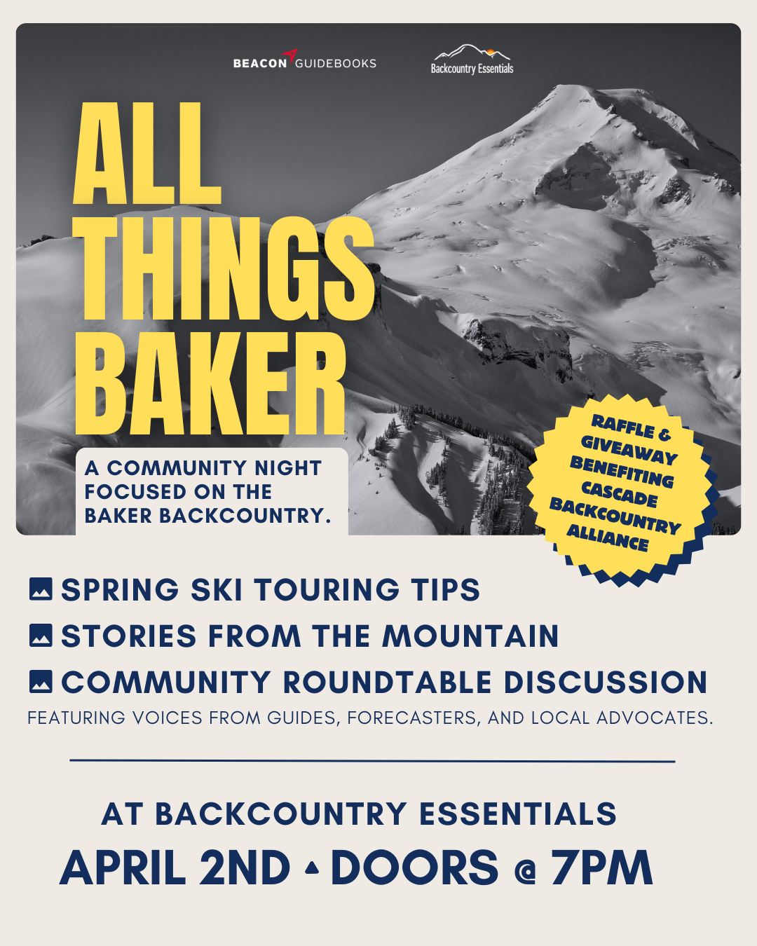 All Things Baker: Backcountry Night Join Backcountry Essentials & Beacon Guidebooks on April 2 at 7pm for an evening of spring touring tips, stories from Mount Baker, and a community roundtable on access,... |