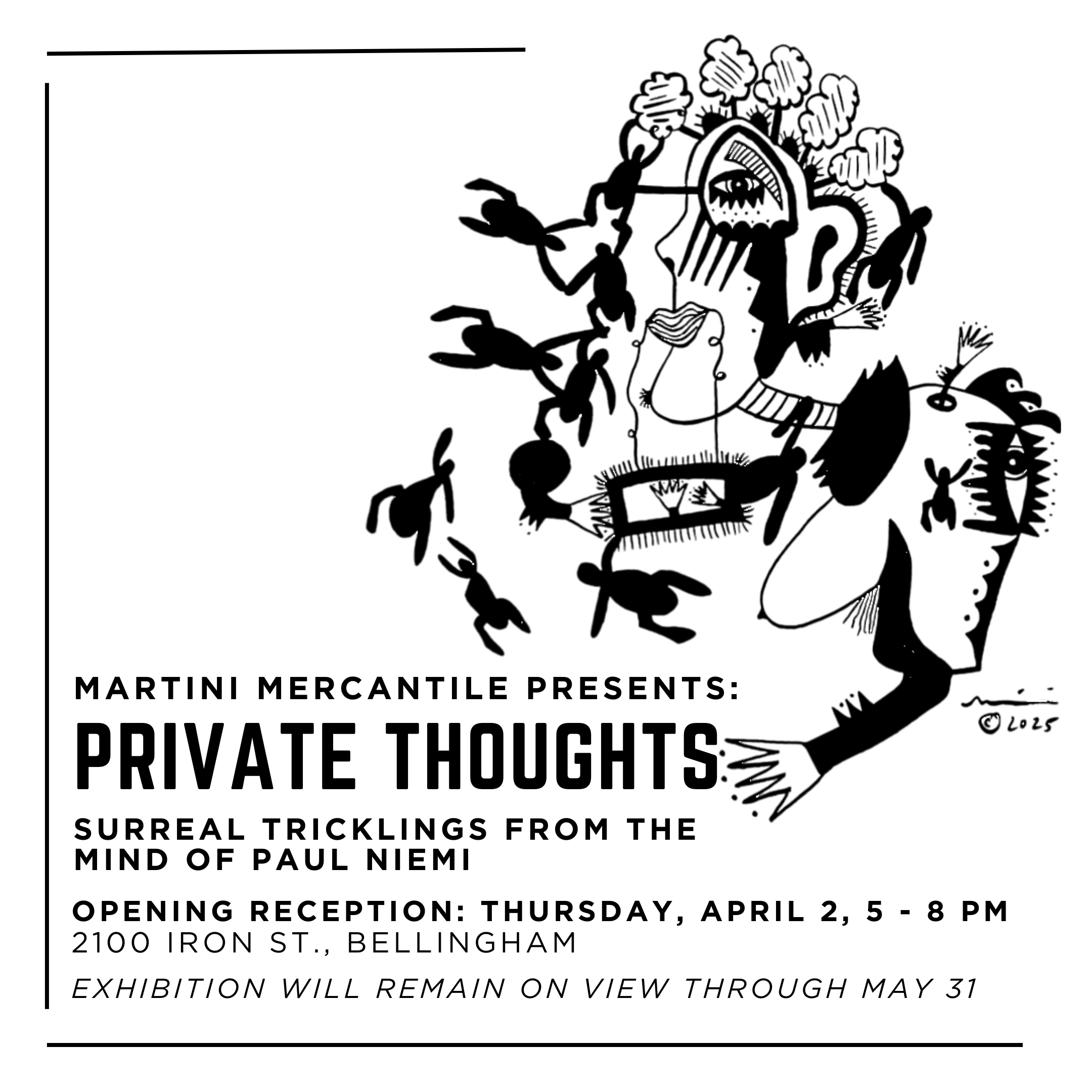 Join us at Martini Mercantile for Private Thoughts: Surreal Tricklings from the Mind of Paul Niemi. Paul’s intricate ink drawings feel like quiet transmissions from the subconscious, where lines wander, hidden worlds emerge, and reality blurs just a little. It’s thoughtful, mysterious, and the kind of work you can stare at for a long time and still...