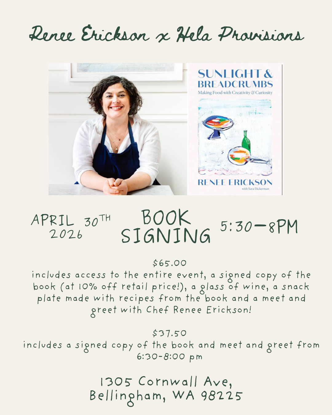 Join us and special guest speaker Chef Renee Erickson on April 30th. Chef Renee will be in store from 5:30 - 8:00 pm, doing an Author talk from 6 - 6:30, and signing books until 8. This ticket includes access to the entire event: - Chef Renee Erickson Author Talk - Glass of Wine - Snack Plate made from recipes from “Sunlight and Breadcrumbs” - Copy of “Sunlight and Breadcrumbs” (10% off... |