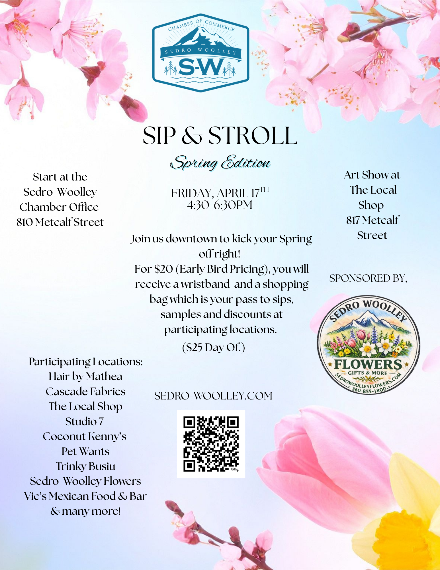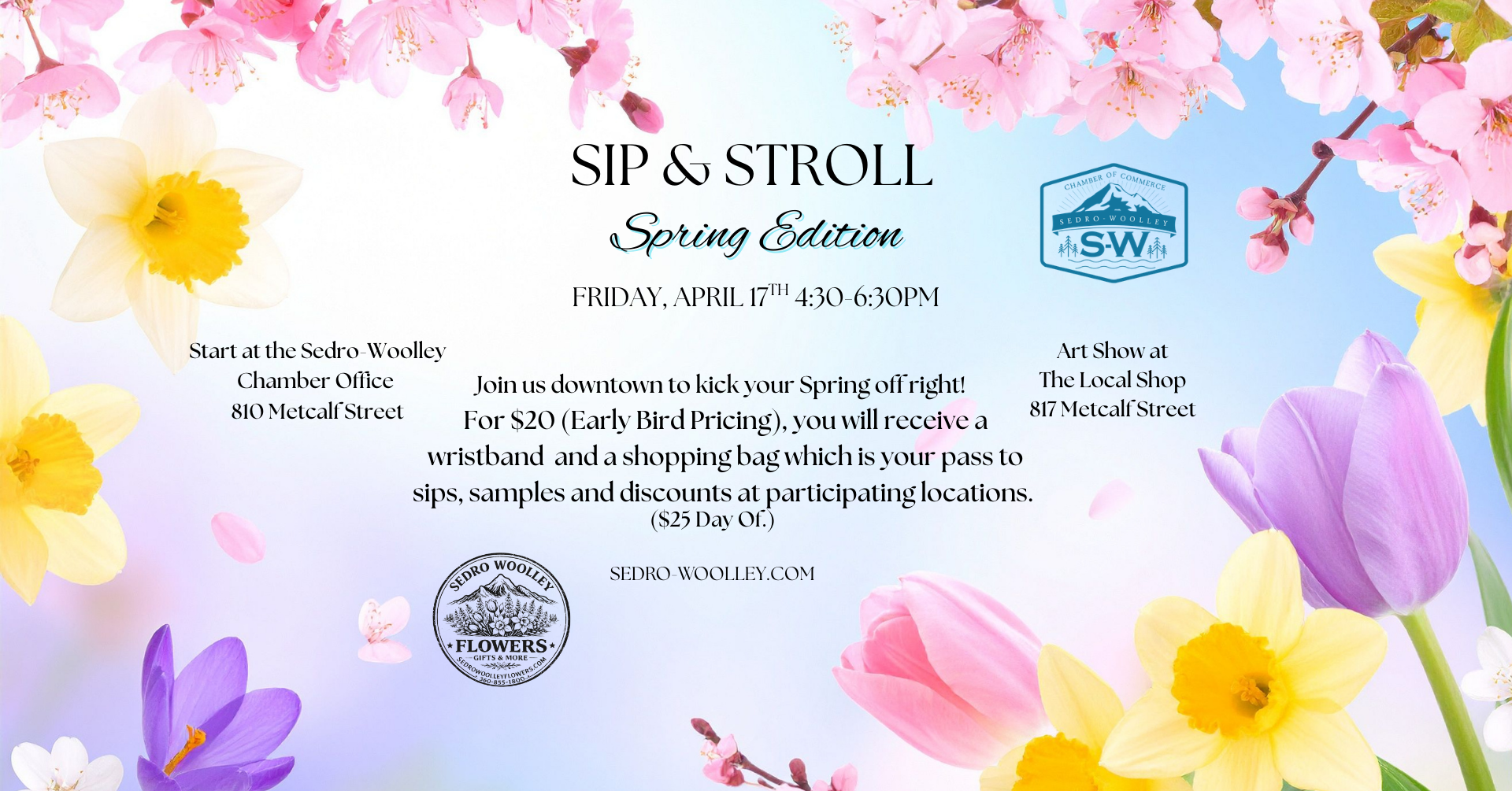 Join us downtown to kick your Spring off right! For $20, you will receive a wristband and a shopping bag which is your pass to sips, samples and discounts at participating locations. Join us downtown to kick your Spring off right! Avoid the Tulip traffic and come downtown to Sedro-Woolley to Eat, Sip, Shop & Stroll through town. Early bird pricing...