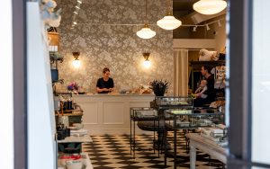 Step inside Azzurra and you’re met with quiet elegance—a space designed to feel light and intentional, from the wallpaper to the marble-slab counter and the hand-built wooden stage.