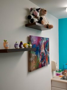 Grimes shows me around the center, starting at the room the team refers to as “BC Maxx,” which is stocked with diapers, sanitary products, handmade quilts, toys and games, and other daily essentials, hygiene items, and comfort items that can’t be procured with state or federal assistance programs. From there, we head downstairs to see the interview room, family area, and medical examination room—every inch of the space has been set up with the child’s safety and comfort in mind, as well as compassion for any family members who may have accompanied them, including siblings who may be afraid or bored.